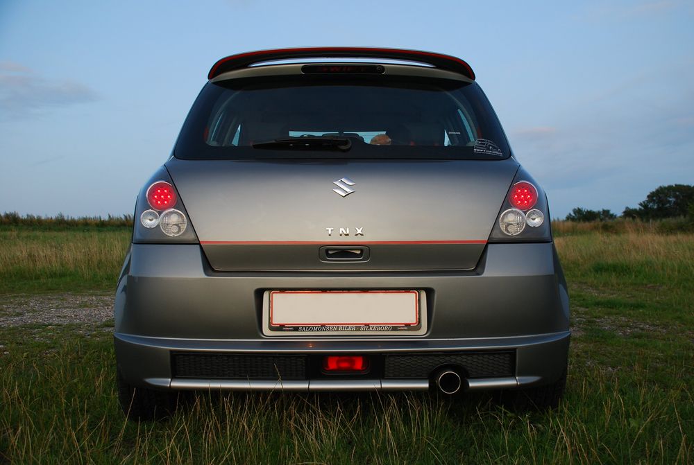 Lækker baggrund + nye lygter.. En flot baggrund.. Så fik Swiften briller på.. Billeder ved solnedgang vil ALTID være flotte.. Nice..:D Lækkert at stå på en top ved solnedgang.. Uden blitz.. Så kan det se lyst ud.. Ja, for mørkt var det ikke men lækkert ser det da ud..hehe Suzukiswift.dk mærket er på..:o) Så kom mærket på.. Sorte striber er nu ret lækkert sammen med de røde..