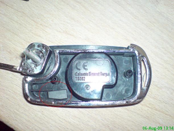 Picture 4: This is the transponder. VERY IMPORTANT!! This deactivates your immobiliser, so you can drive your car. I got it out by gently tapping the whole key on a table. Or you can take a small needle and try to poke it out.