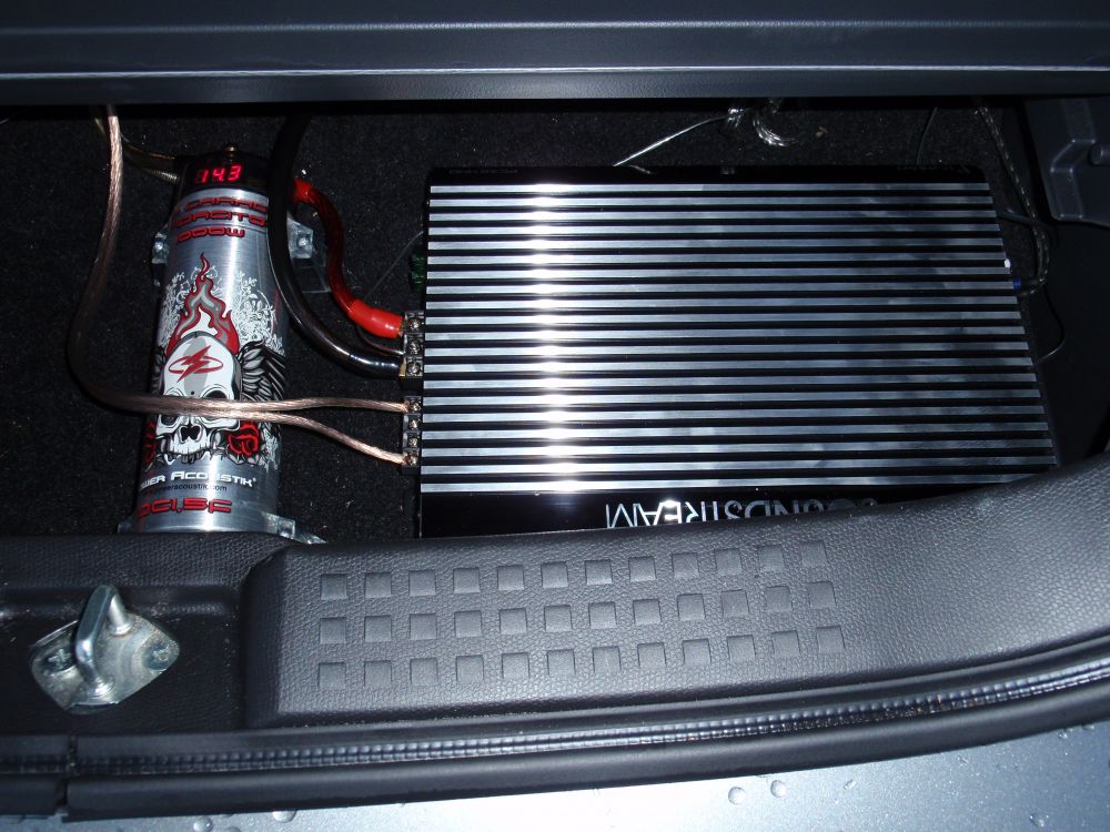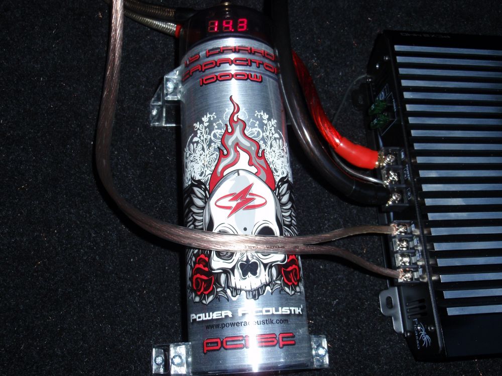 I følge carsound's hjemmeside kan kondensator og forstærker sagtens dele stel, den skal dog naturligvis være parallel forbundet!
