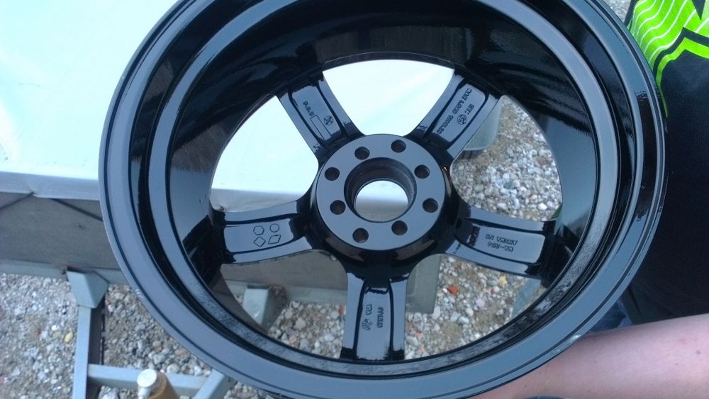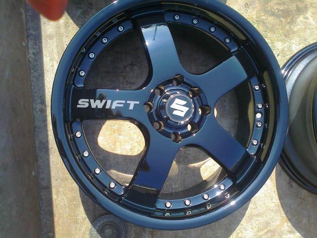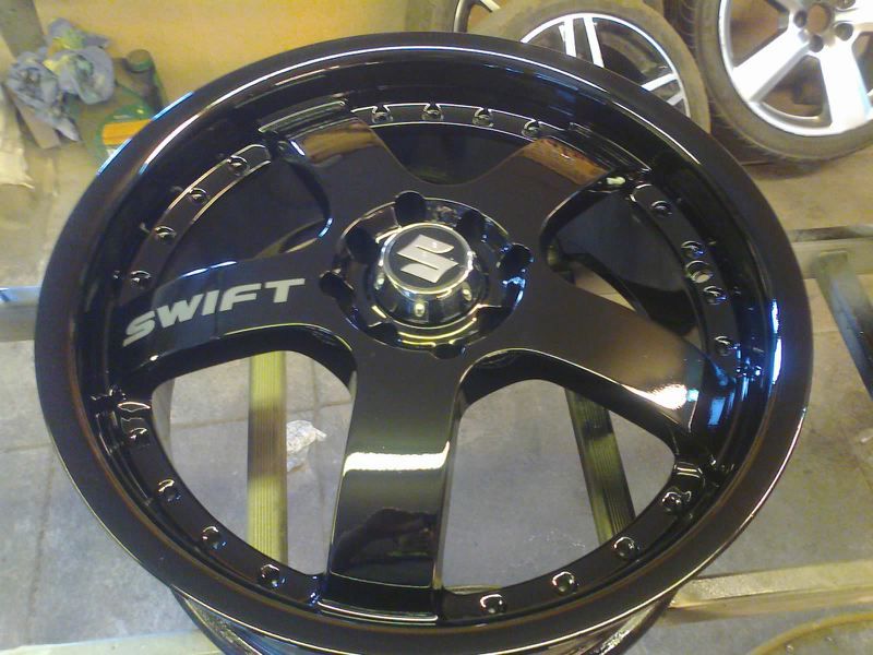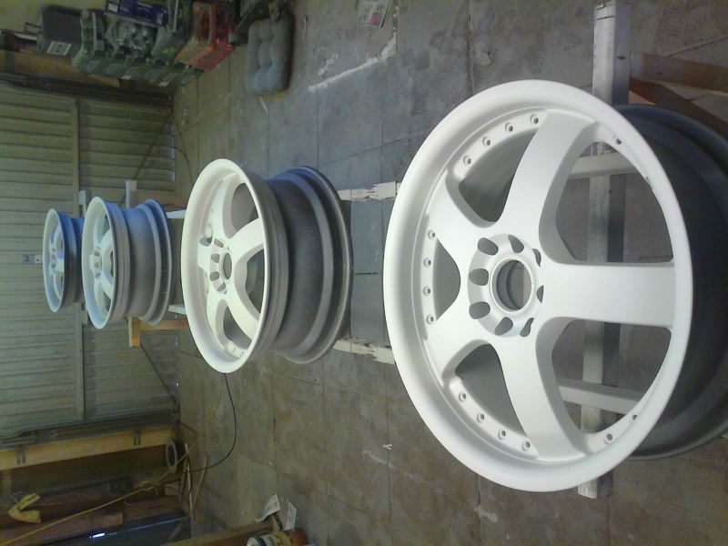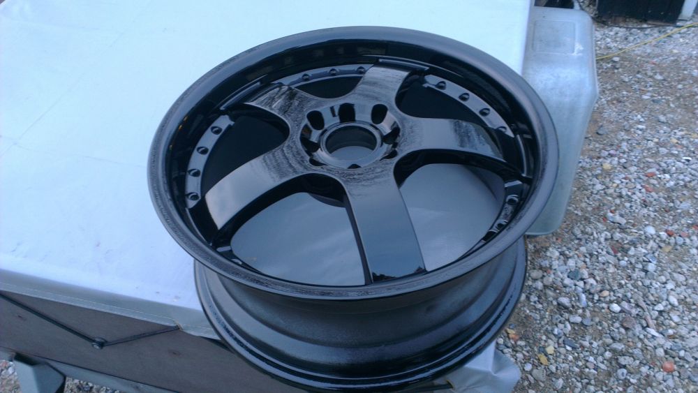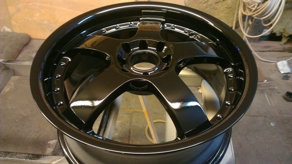 Så der mangler der kun lige dæk plus rustfri stål skuer lange fælgens kant Fælgene bliver grundet Så er fælgene malet en dyb sort lak Så er fælgene malet en dyb sort lak Så er fælgene malet en dyb sort lak Så fælgene grundet og klar spartel