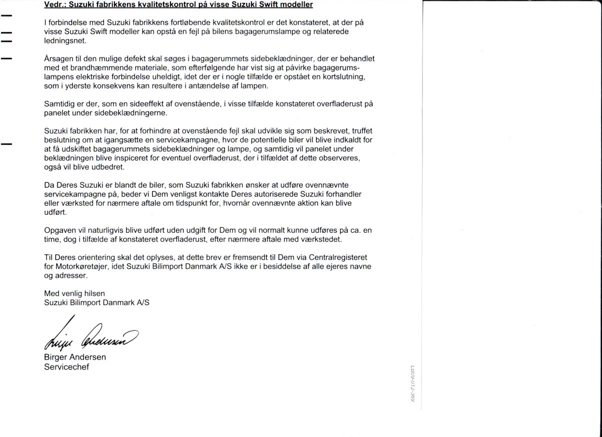 Tak for jeres mail og foto vedr. den observerede rust under bagagerummets sidebeklædning på jeres Suzuki Swift.